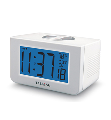 Accurate radio controlled time ― Big blue LCD display with blue back light ― Clear human voice reporting the time ― With Alarm and snooze ― Temperature display ― Humidity display ― 10 minutes, 20 minutes, 30 minutes, 40 minutes, 50minutes, 60 minutes, & 90 minutes short-out countdown timer ― battery (not included) powered ― Dimension:120mmX70mmX70mm |
